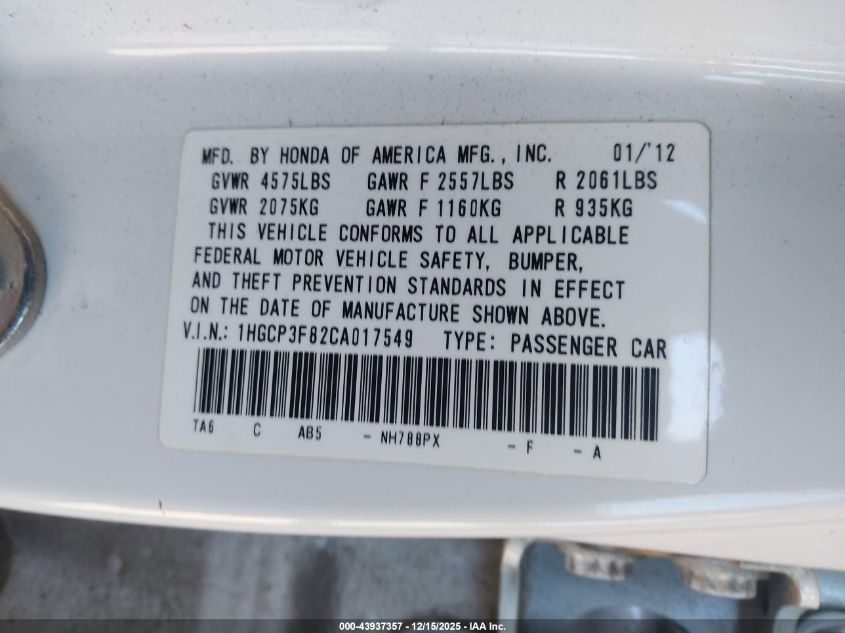 2012 HONDA ACCORD - 1HGCP3F82CA017549, цвет - Белый, 3.5, Бензин, Передний привод из США