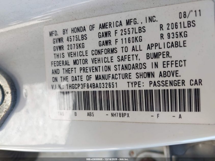 2011 HONDA ACCORD - 1HGCP3F84BA032651, цвет - , 3.5, Бензин, Передний привод из США