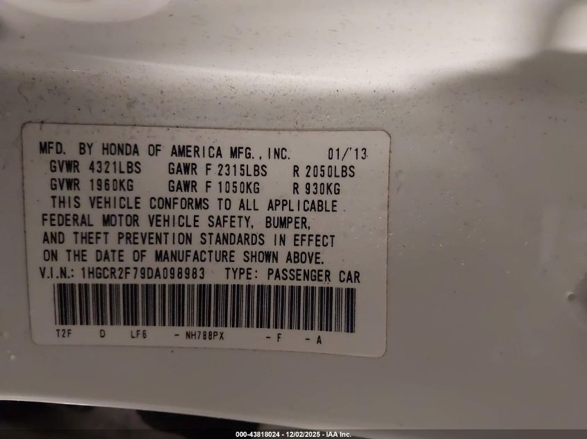 2013 HONDA ACCORD - 1HGCR2F79DA098983, цвет - Белый, 2.4, Бензин, Передний привод из США