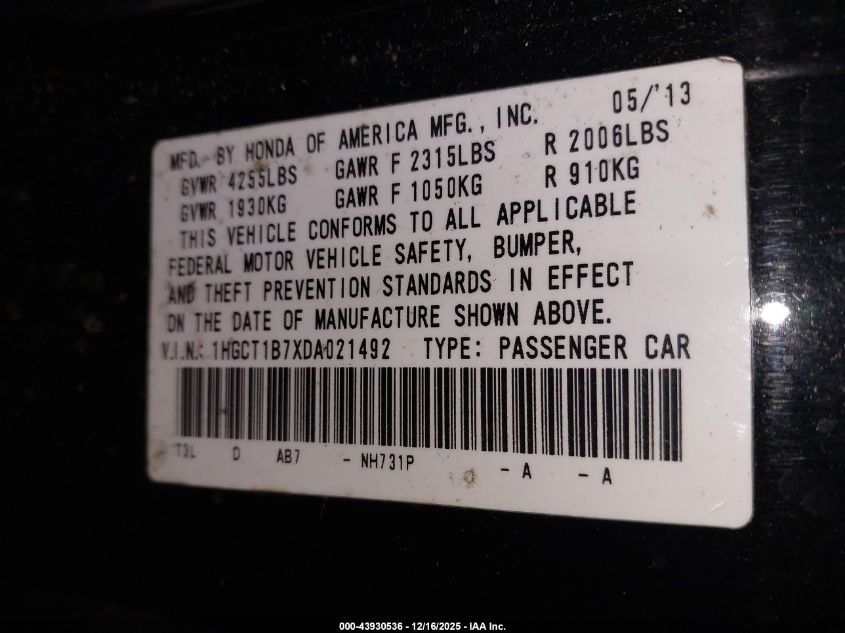 2013 HONDA ACCORD - 1HGCT1B7XDA021492, цвет - Черный, 2.4, Бензин, Передний привод из США