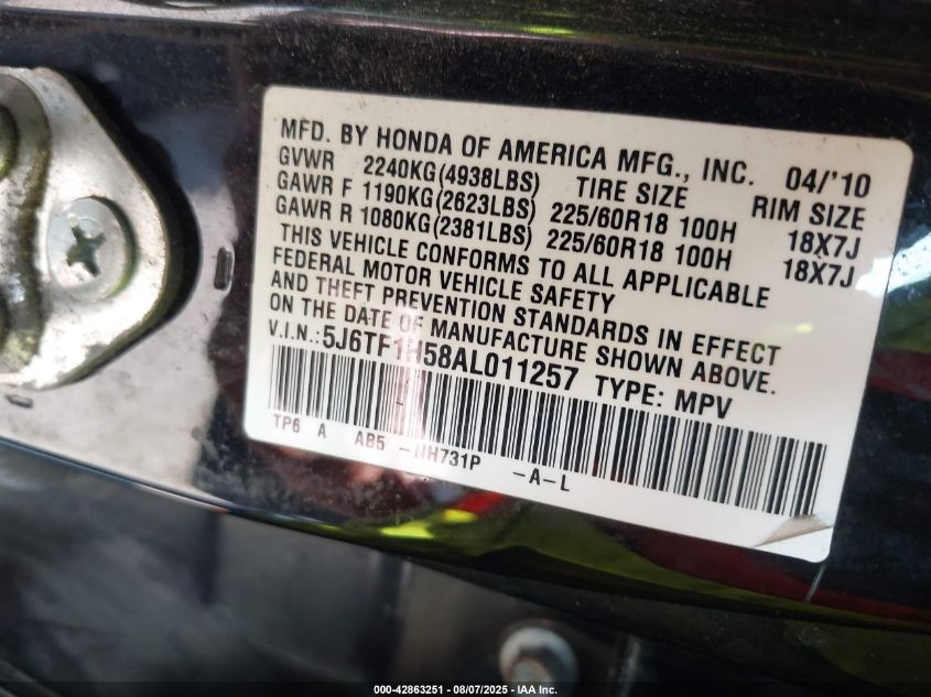 Цвет ЧерныйЦилиндры 6Привод Передний приводVIN 5J6TF1H58AL011257Состояние Заводится и едет (проверено)Повреждения Передняя или задняя
