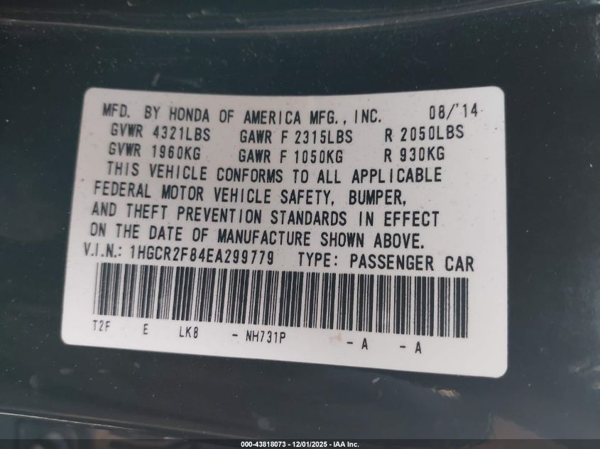 2014 HONDA ACCORD - 1HGCR2F84EA299779, цвет - Черный, 2.4, Бензин, Передний привод из США