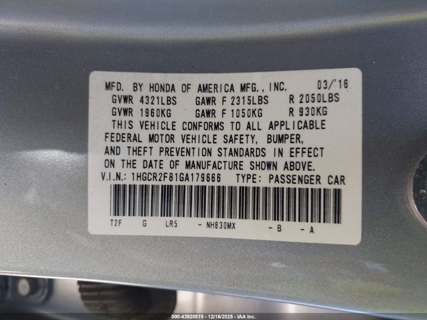 2016 HONDA ACCORD - 1HGCR2F81GA179666, цвет - Серебряный, 2.4, Бензин, Передний привод из США
