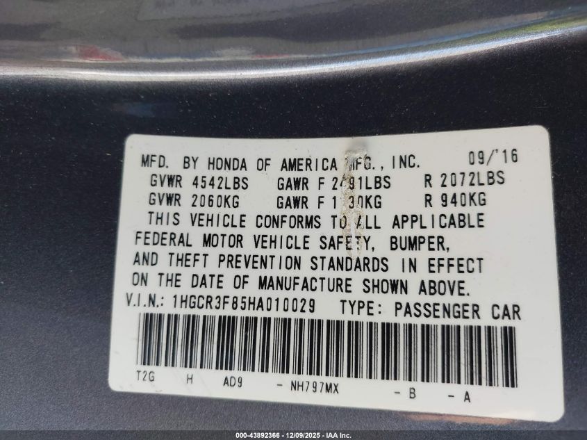 Цвет СерыйЦилиндры 6Привод Передний приводVIN 1HGCR3F85HA010029Состояние Заводится и едет (проверено)Повреждения Передняя или задняя