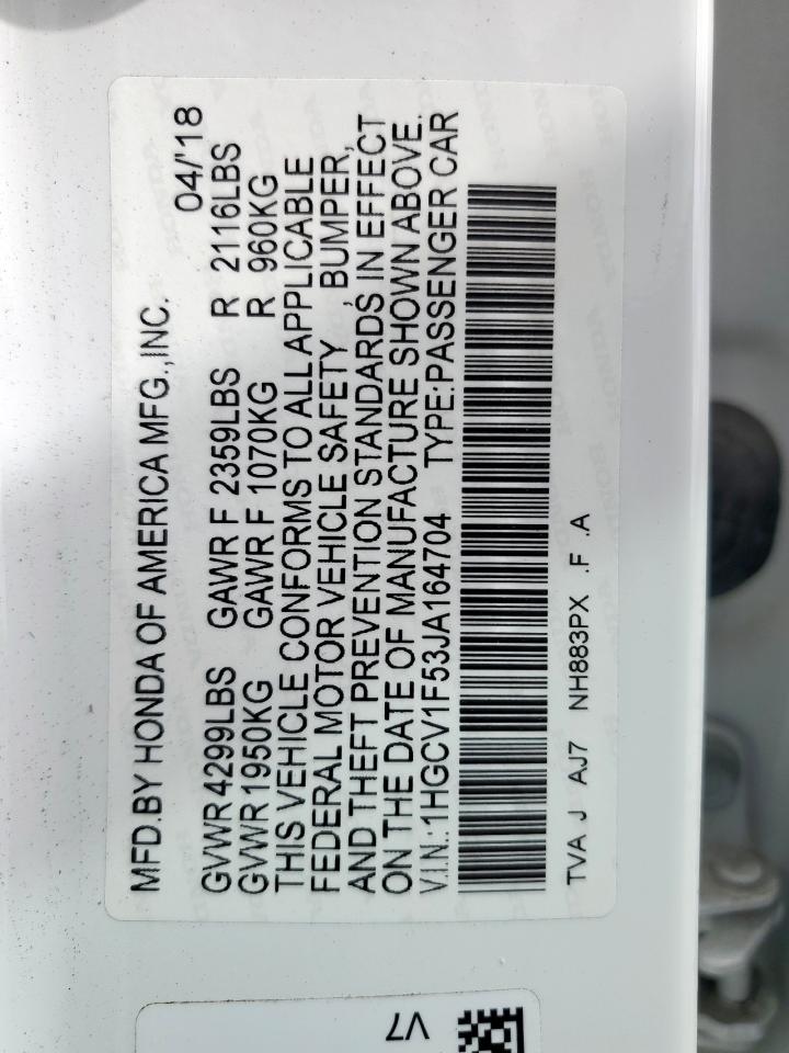 2018 HONDA ACCORD - 1HGCV1F53JA164704, цвет - Белый, 1.5, Бензин, из США