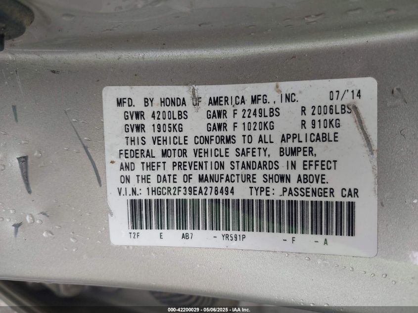 2014 HONDA ACCORD - 1HGCR2F39EA278494, цвет - Бежевый, 2.4, Бензин, Передний привод из США
