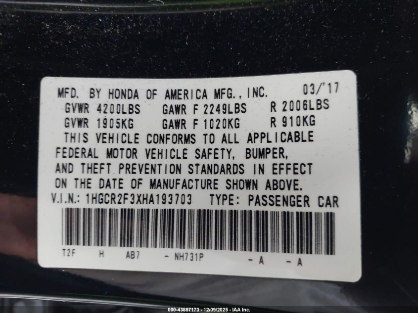 2017 HONDA ACCORD - 1HGCR2F3XHA193703, цвет - Черный, 2.4, Бензин, Передний привод из США