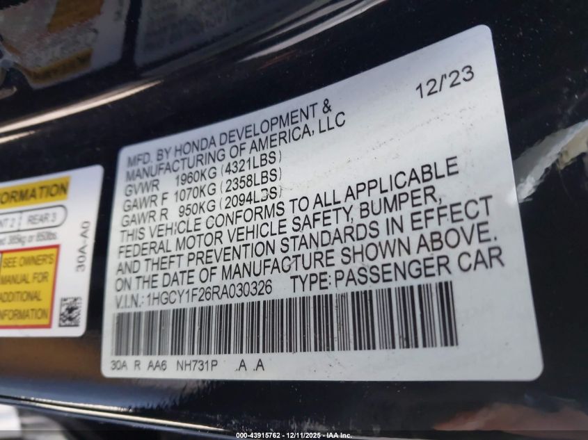 2024 HONDA ACCORD - 1HGCY1F26RA030326, цвет - Черный, 1.5, Бензин, Передний привод из США