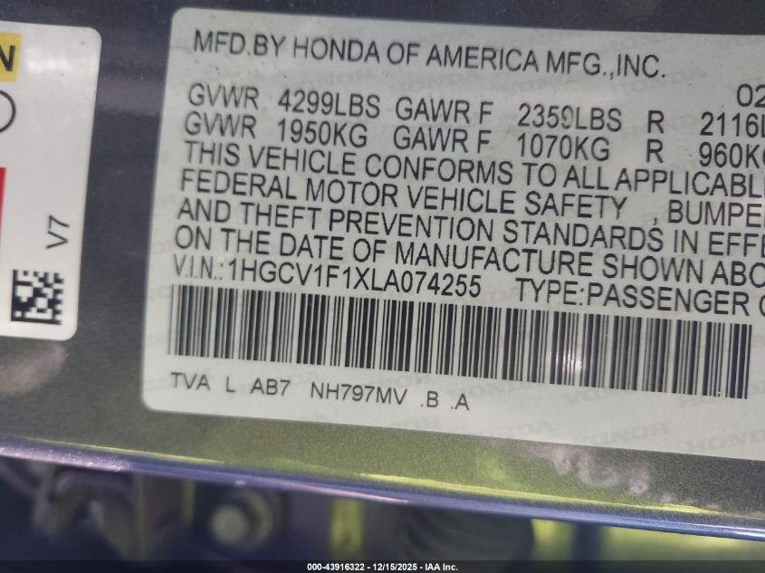 2020 HONDA ACCORD - 1HGCV1F1XLA074255, цвет - , 1.5, Бензин, Передний привод из США