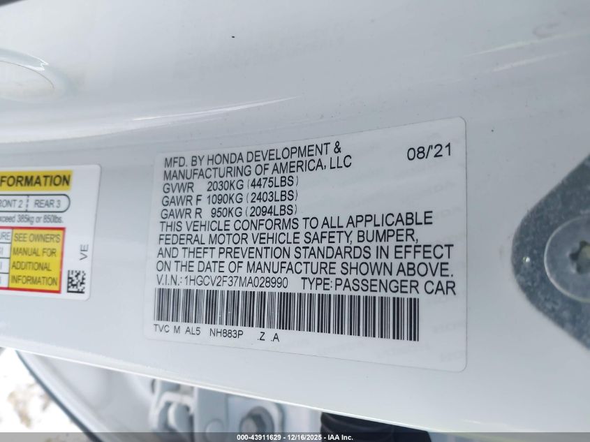 2021 HONDA ACCORD - 1HGCV2F37MA028990, цвет - Белый, 2.0, Бензин, Передний привод из США