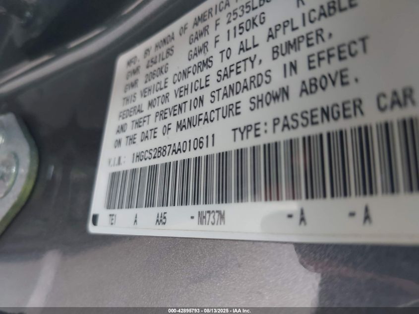 Цвет СерыйЦилиндры 6Привод Передний приводVIN 1HGCS2B87AA010611Состояние Заводится и едет (проверено)Повреждения Передняя или задняя