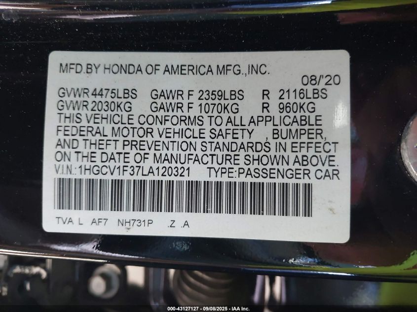 2020 HONDA ACCORD - 1HGCV1F37LA120321, цвет - Черный, 1.5, Бензин, Передний привод из США