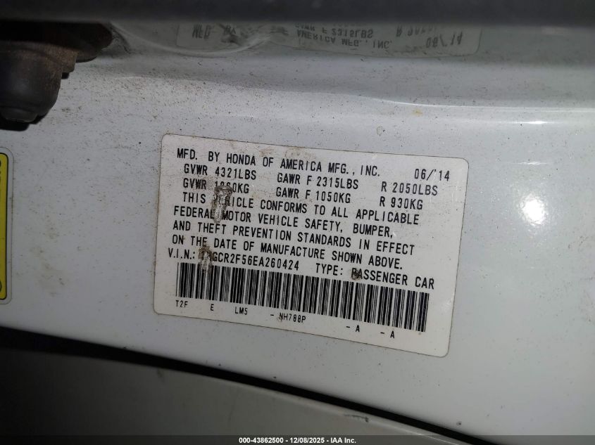 2014 HONDA ACCORD - 1HGCR2F56EA260424, цвет - Белый, 2.4, Бензин, Передний привод из США