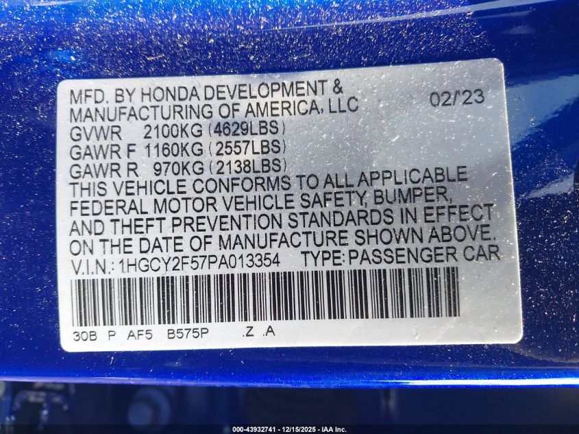 2023 HONDA ACCORD - 1HGCY2F57PA013354, цвет - Синий, 2.0, Гибрид, Передний привод из США