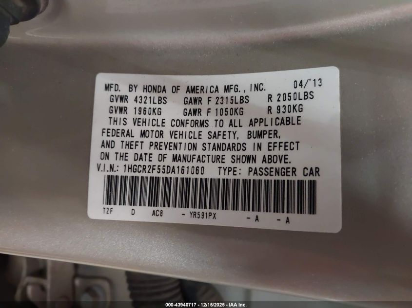 Цвет ЗолотойЦилиндры 4Привод Передний приводVIN 1HGCR2F55DA161060Состояние СтационарноПовреждения Передняя или задняя