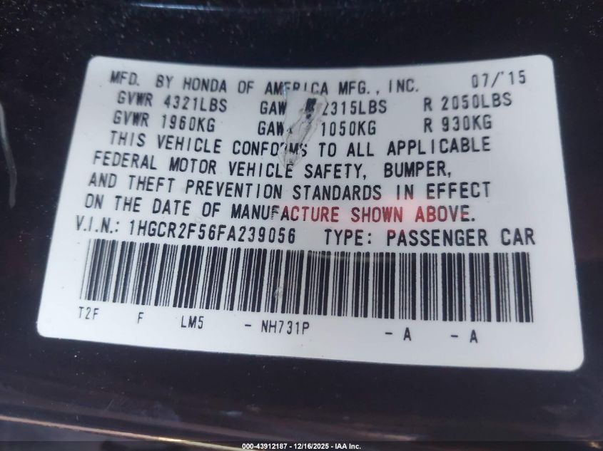 2015 HONDA ACCORD - 1HGCR2F56FA239056, цвет - , 2.4, Бензин, Передний привод из США