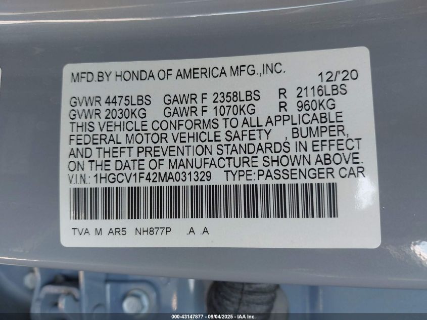 2021 HONDA ACCORD - 1HGCV1F42MA031329, цвет - Синий, 1.5, Бензин, Передний привод из США