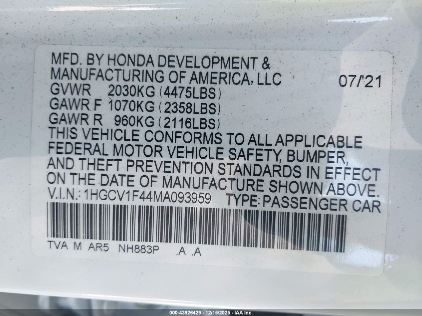 2021 HONDA ACCORD - 1HGCV1F44MA093959, цвет - Белый, 1.5, Бензин, Передний привод из США