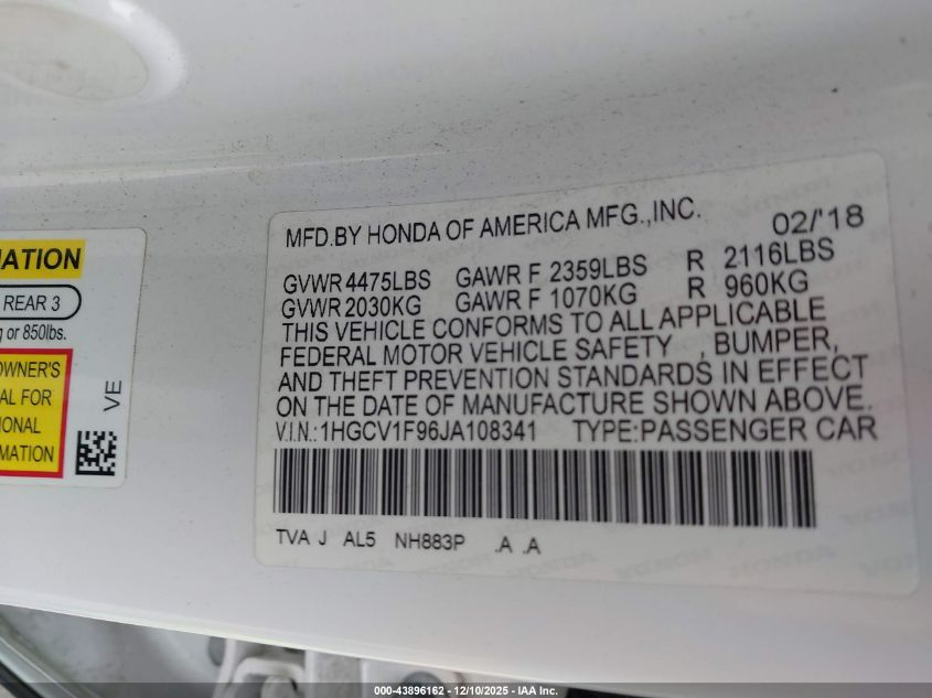 2018 HONDA ACCORD - 1HGCV1F96JA108341, цвет - Белый, 1.5, Бензин, Передний привод из США