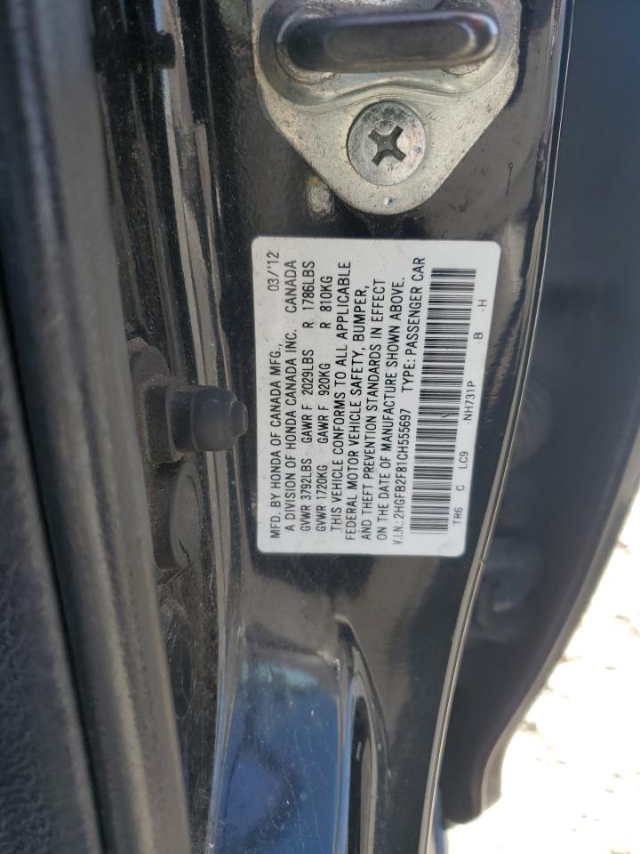 2012 HONDA CIVIC - 2HGFB2F81CH555697, цвет - Черный, 1.8, Бензин, из США