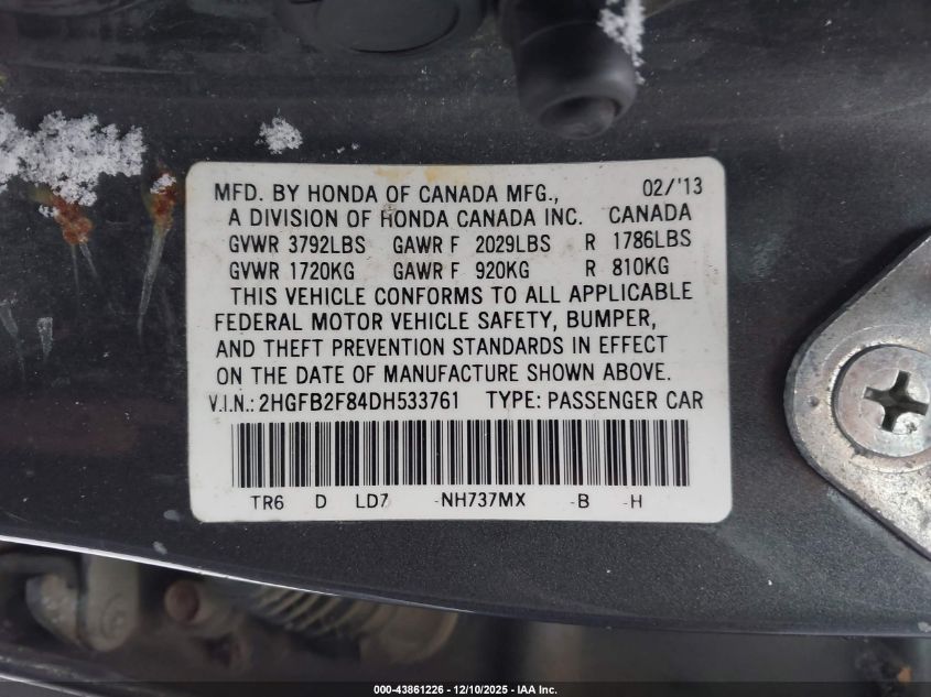 2013 HONDA CIVIC - 2HGFB2F84DH533761, цвет - Серый, 1.8, Бензин, Передний привод из США