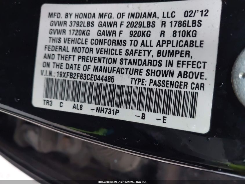 2012 HONDA CIVIC - 19XFB2F83CE044485, цвет - Черный, 1.8, Бензин, Передний привод из США