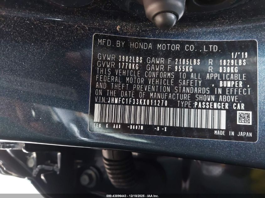 2019 HONDA CIVIC - JHMFC1F33KX011270, цвет - Синий, 1.5, Бензин, Передний привод из США
