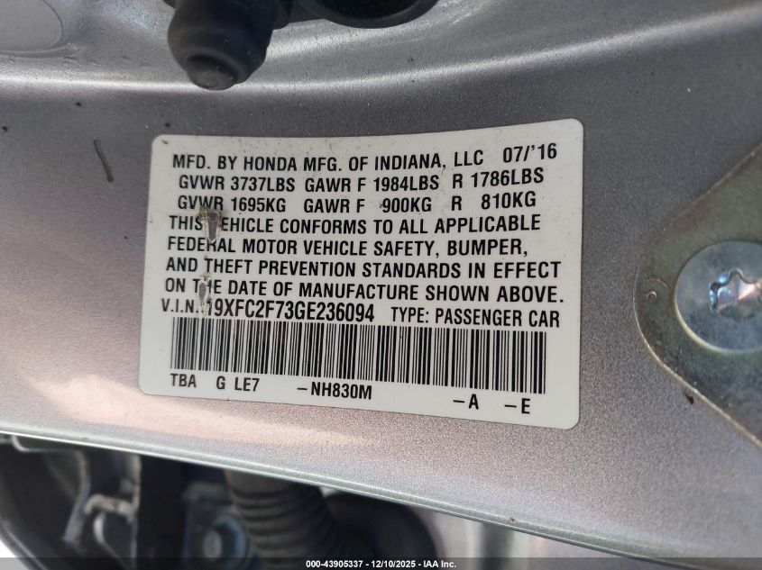 2016 HONDA CIVIC - 19XFC2F73GE236094, цвет - Серый, 2.0, Бензин, Передний привод из США