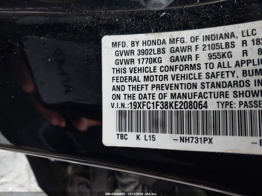 Цвет СерыйЦилиндры 4Привод Передний приводVIN 19XFC1F38KE208064Состояние Заводится и едет (проверено)Повреждения Передняя или задняя