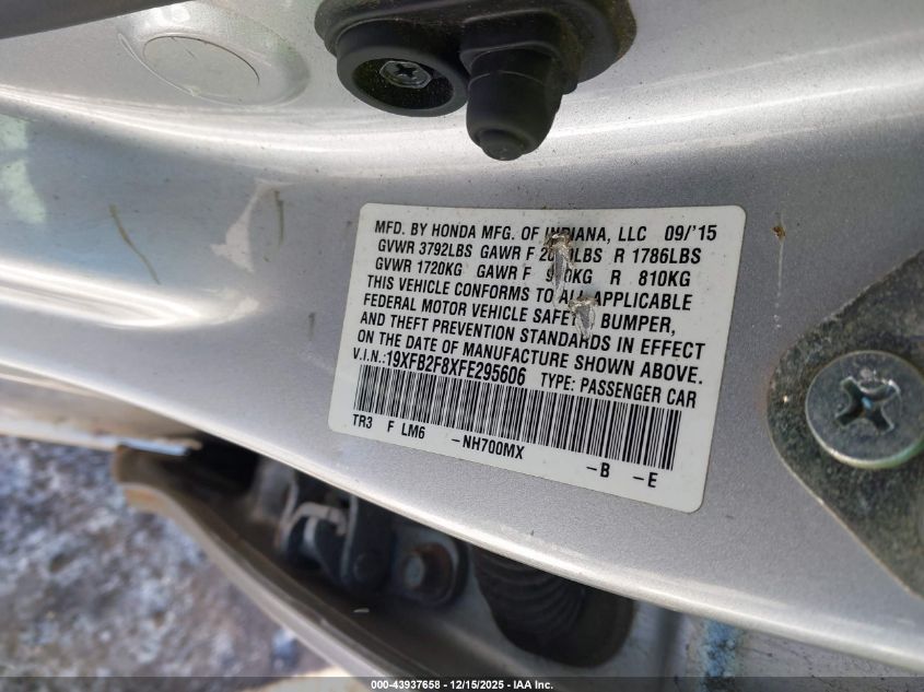 2015 HONDA CIVIC - 19XFB2F8XFE295606, цвет - Серый, 1.8, Бензин, Передний привод из США