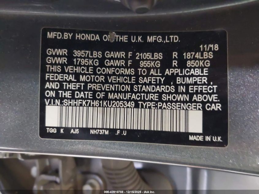 2019 HONDA CIVIC - SHHFK7H61KU205349, цвет - Серый, 1.5, Бензин, Передний привод из США