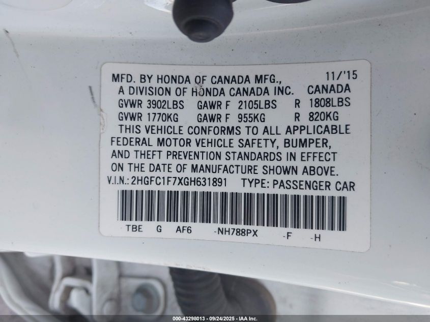 2016 HONDA CIVIC - 2HGFC1F7XGH631891, цвет - Белый, 1.5, Бензин, Передний привод из США