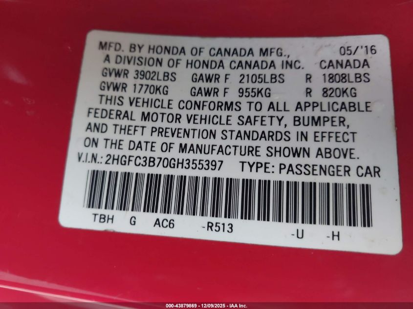 Цвет КрасныйЦилиндры 4Привод Передний приводVIN 2HGFC3B70GH355397Состояние СтационарноПовреждения Био/Химические