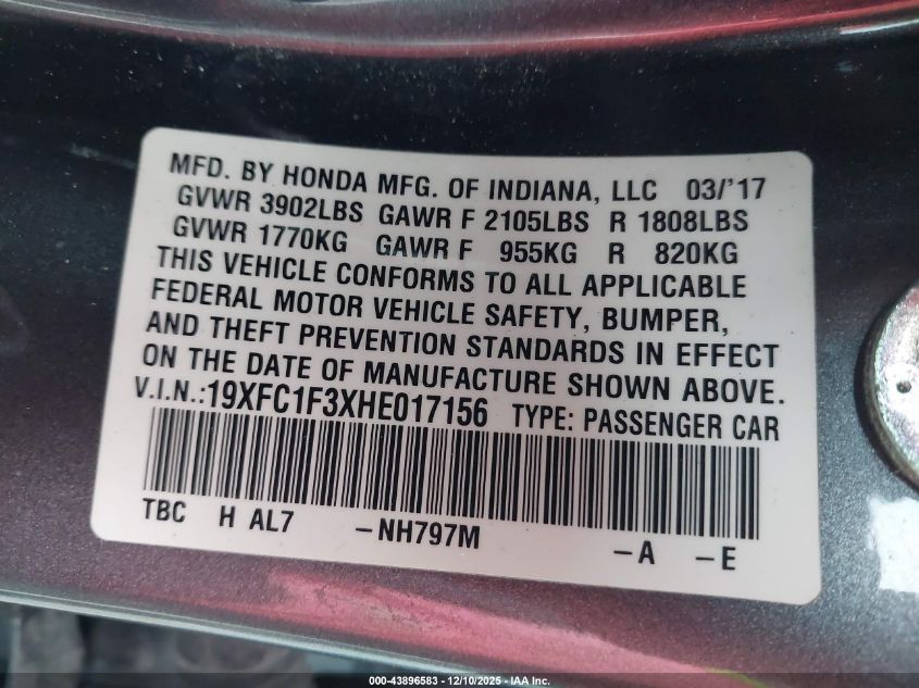 Цвет СерыйЦилиндры 4Привод Передний приводVIN 19XFC1F3XHE017156Состояние Заводится и едет (проверено)Повреждения Передняя или задняя