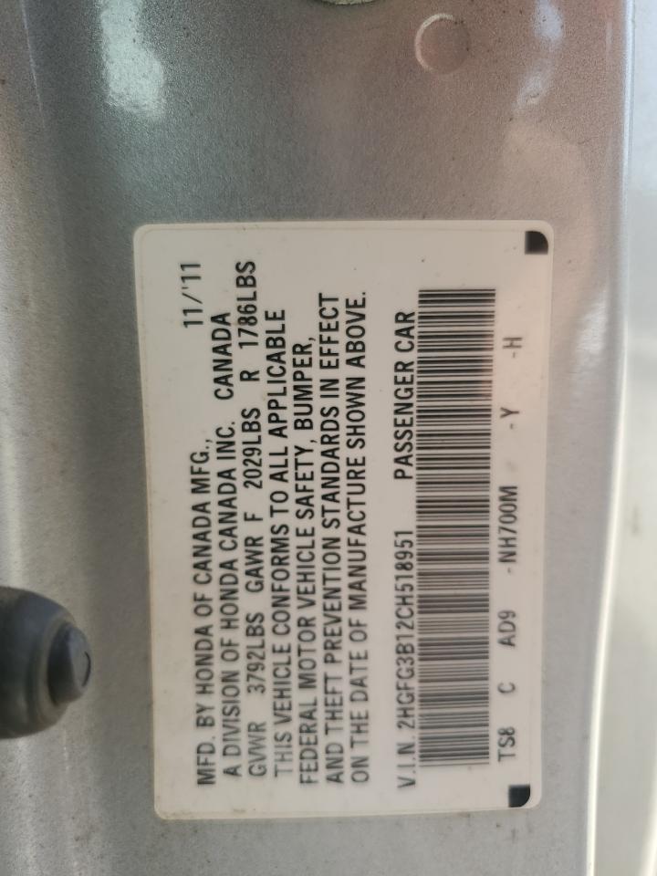 2012 HONDA CIVIC - 2HGFG3B12CH518951, цвет - Серебряный, 1.8, Бензин, из США