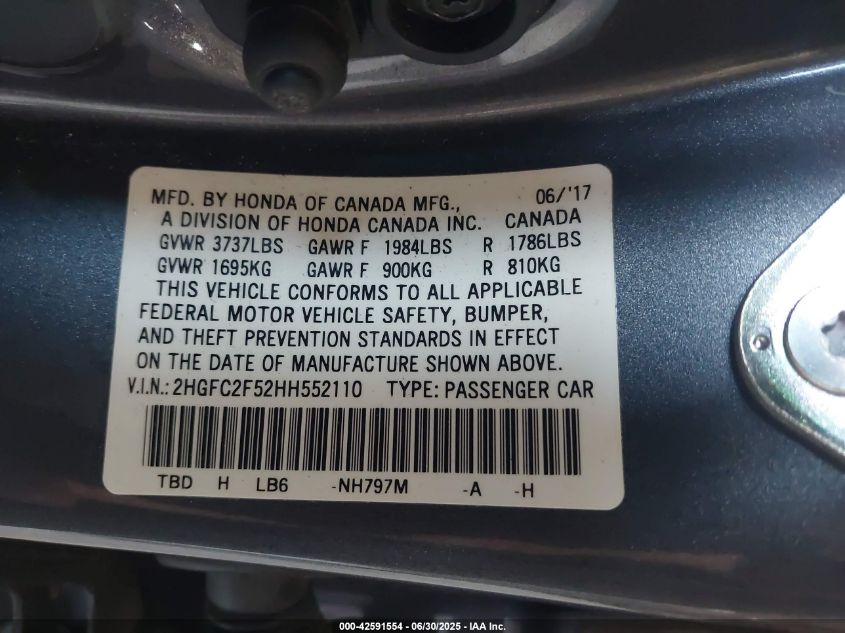 2017 HONDA CIVIC - 2HGFC2F52HH552110, цвет - Серый, 2.0, Бензин, Передний привод из США