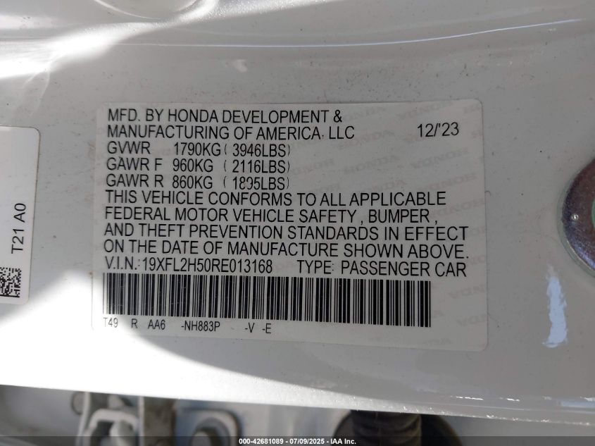 2024 HONDA CIVIC - 19XFL2H50RE013168, цвет - Белый, 2.0, Бензин, Передний привод из США
