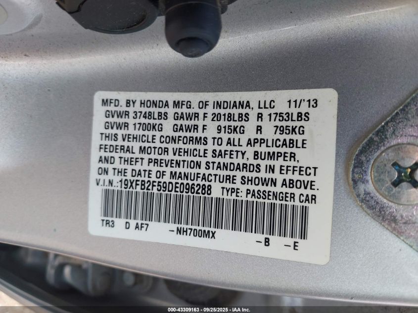 Цвет СерыйЦилиндры 4Привод Передний приводVIN 19XFB2F59DE096288Состояние Заводится и едет (проверено)Повреждения Передняя или задняяДата аукциона 2025-12-17