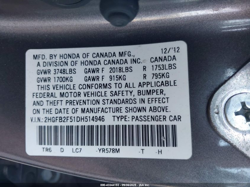 2013 HONDA CIVIC - 2HGFB2F51DH514946, цвет - Бежевый, 1.8, Бензин, Передний привод из США