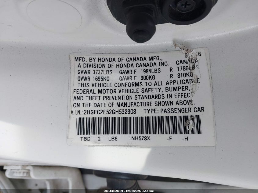 2016 HONDA CIVIC - 2HGFC2F52GH532308, цвет - Белый, 2.0, Бензин, Передний привод из США