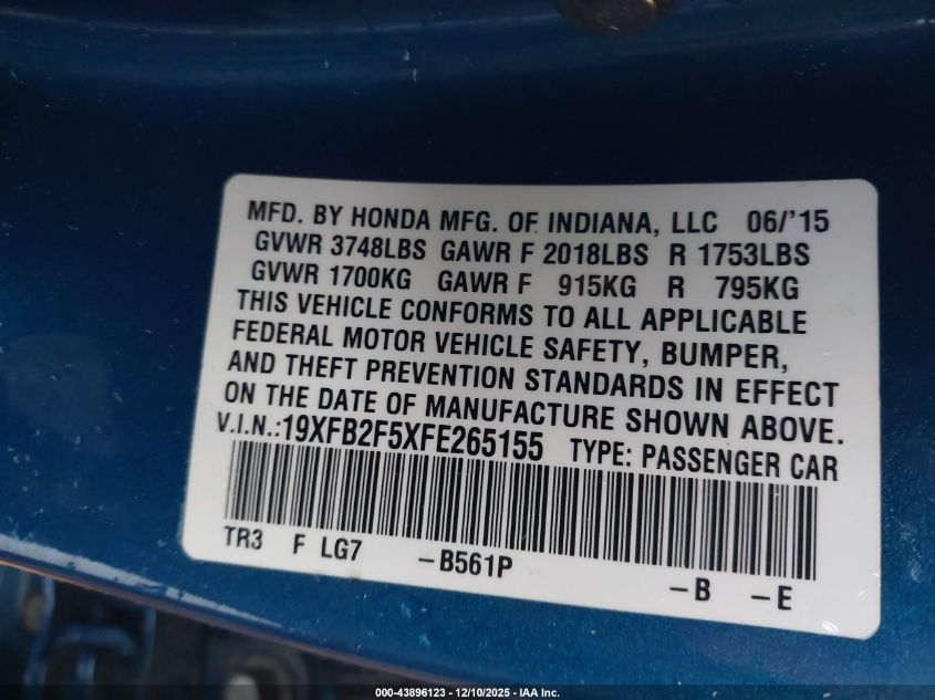 2015 HONDA CIVIC - 19XFB2F5XFE265155, цвет - Синий, 1.8, Бензин, Передний привод из США