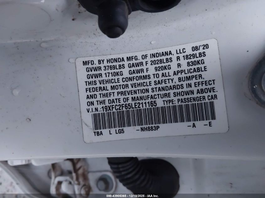 2020 HONDA CIVIC - 19XFC2F65LE211165, цвет - Белый, 2.0, Бензин, Передний привод из США
