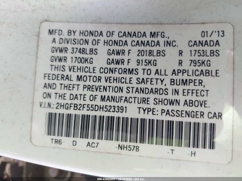 2013 HONDA CIVIC - 2HGFB2F55DH523391, цвет - Белый, 1.8, Бензин, Передний привод из США