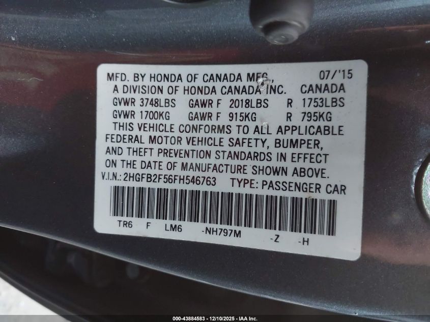 2015 HONDA CIVIC - 2HGFB2F56FH546763, цвет - Серый, 1.8, Бензин, Передний привод из США