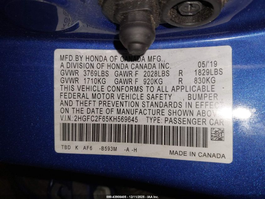 2019 HONDA CIVIC - 2HGFC2F65KH569645, цвет - Синий, 2.0, Бензин, Передний привод из США
