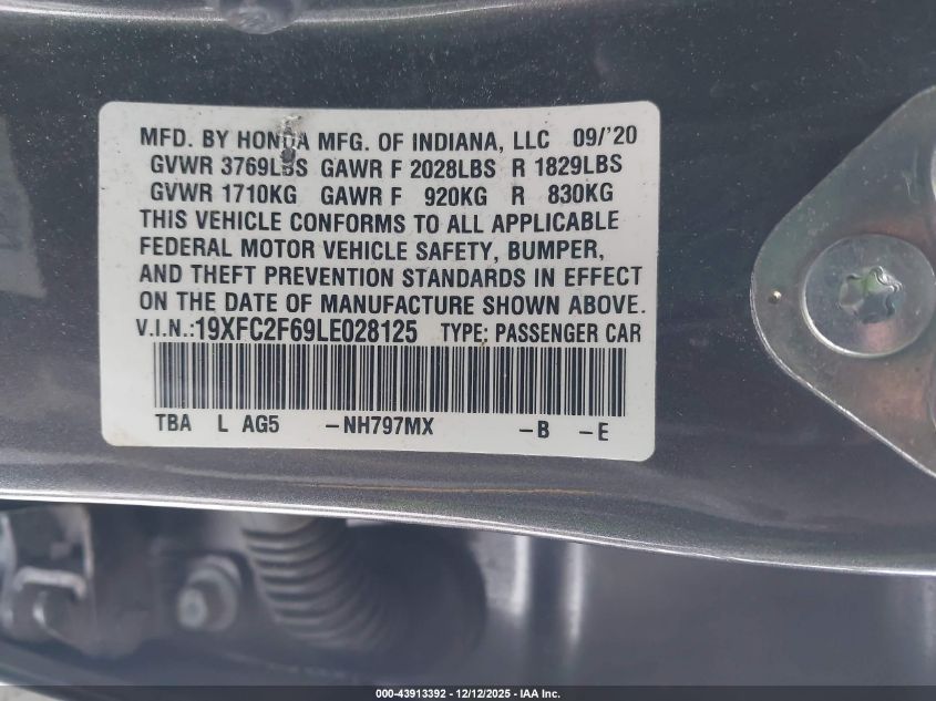 2020 HONDA CIVIC - 19XFC2F69LE028125, цвет - Серый, 2.0, Бензин, Передний привод из США