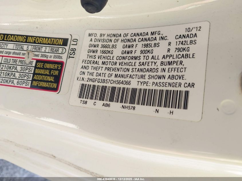 2012 HONDA CIVIC - 2HGFG3B57CH564066, цвет - Белый, 1.8, Бензин, Передний привод из США