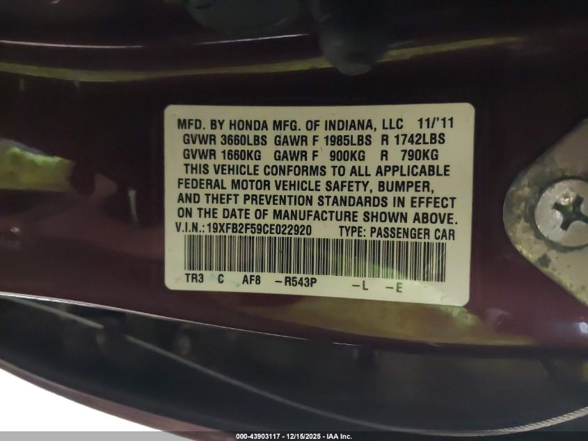 2012 HONDA CIVIC - 19XFB2F59CE022920, цвет - Бургундия, 1.8, Бензин, Передний привод из США