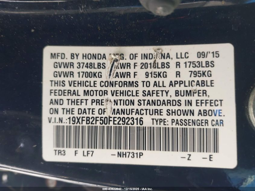 Цвет ЧерныйЦилиндры 4Привод Передний приводVIN 19XFB2F50FE292316Состояние НеизвестноПовреждения Левая сторона