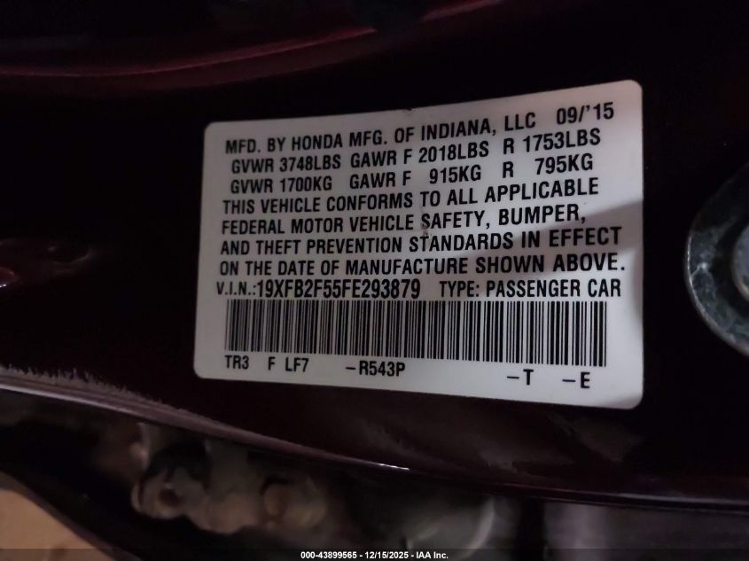 2015 HONDA CIVIC - 19XFB2F55FE293879, цвет - Бордовый, 1.8, Бензин, Передний привод из США